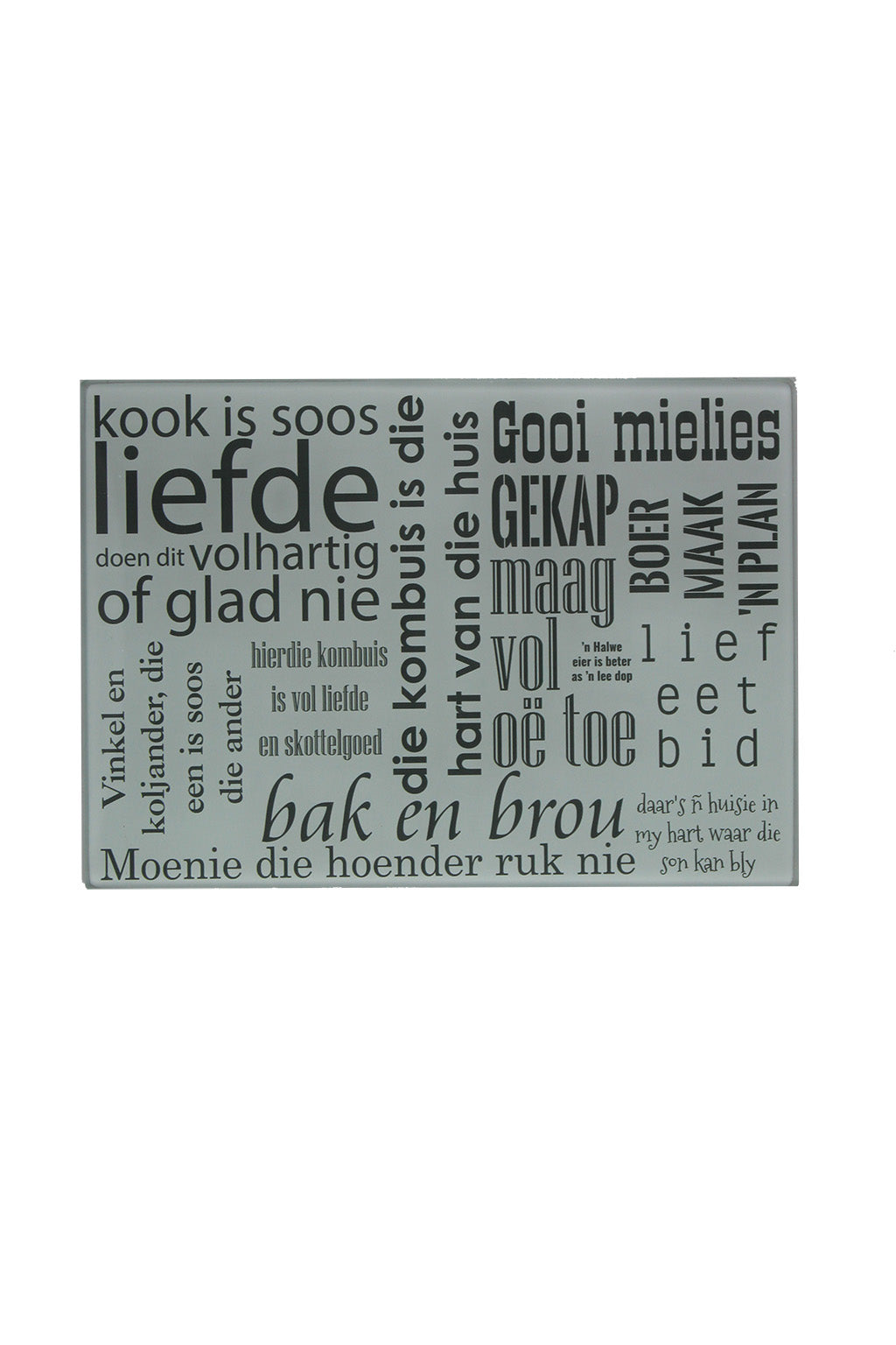“Boer Maak ‘n Plan” is just one of the many phrases on this unique, sophisticated glass cutting board!