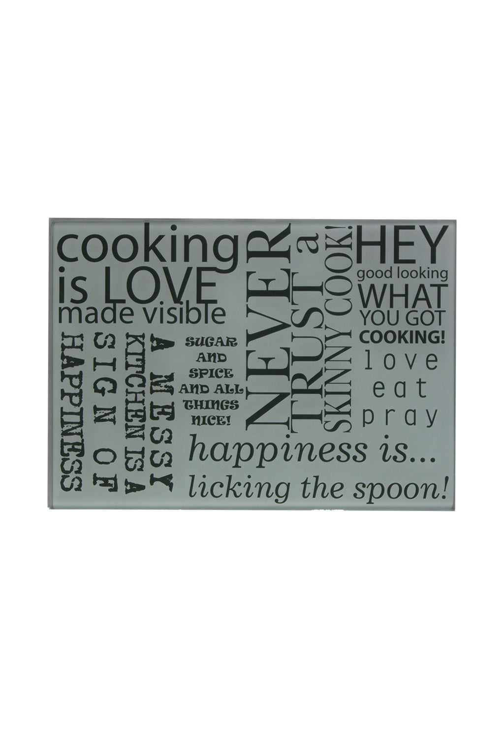 “Sugar and Spice and All Things Nice” is just one of the many phrases on this unique, sophisticated glass cutting board!